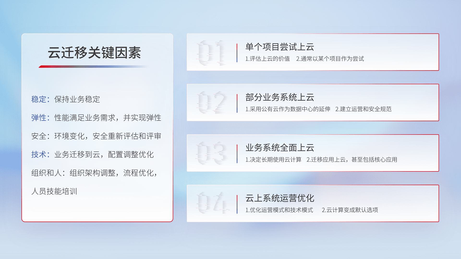 结合实际业务,,,,从规划设计、、、、云平台选型、、、、云原生改造、、数据迁移、、、、集成交付,,迁移全过程为客户识别最佳上云路径,,,做好风险识别管理,,,,设计网络架构、、、、身份权限、、、、安全审计合规、、操作审计、、、、日志审计、、监控告警策略、、、多站点容灾设计等,,,对云上基础设施进行整体规划,,,,提升IT治理水平,,以满足弹性、、高可用、、、高性能的需求。。。。