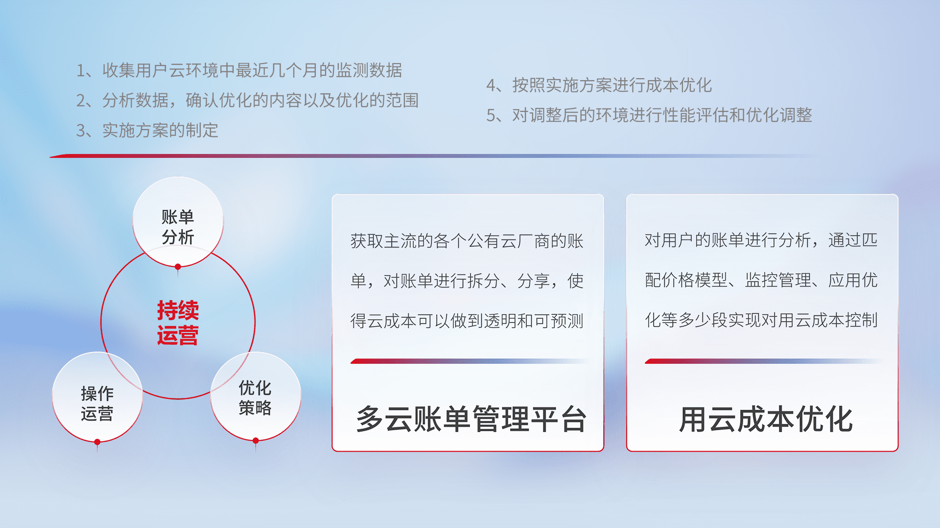 通过多云纳管,,,以统一的资源数据模型把客户的云资源进行抽象和封装,,,进而实现对多云资源的统一操作,,,保障云资源管理的可靠性、、、稳定性与可用性。。。量身定制化运维内容,,配置、、开发运维、、补丁管理、、、备份、、监控、、、认证和访问管理、、、审计和日常巡检等,,保障在用云过程中的可靠度,,,稳定度以及高可用率。。